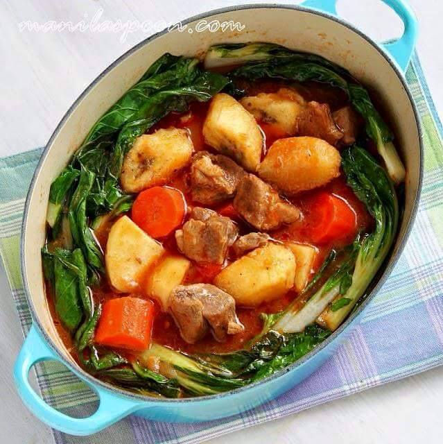 Heat the oil in a deep pot like a Dutch Oven. I used my Le Creuset. Sauté the diced onion for a minute and then add the garlic. Add the pork cubes and coat it with the oil and the aromatics. Stir in the tomatoes and continue to cook until the pork cubes have turned light brown. Pour in the Fish Sauce (Patis) and sprinkle the ground black pepper. Stir. Let it simmer for about 3-5 minutes. Add the broth or water and bring to a boil. Simmer covered until pork is tender (about 30 to 40 minutes). When the pork cubes are tender, add the potatoes and carrots. Pour in the Ketchup or Tomato Sauce. Stir. Simmer again for about 5-6 minutes or until the potatoes and carrots are slightly tender. At this time check the flavors and adjust the seasoning to your taste by adding either salt or sugar or more fish sauce. If it's a little sour (esp if using regular ketchup or tomato sauce) add some brown sugar to achieve a balanced flavor. Add the sliced Burro Bananas and continue to cook until it's tender. Add the Bok Choy leaves, turn off the heat and cover. Let it stand for about 5 minutes. The remaining heat will cook the Bok Choy. Transfer to a serving dish and enjoy with rice! Yum! Some Filipinos eat this with a little fish sauce on the side mixed with a few drops of freshly squeezed Lime juice. Delish!